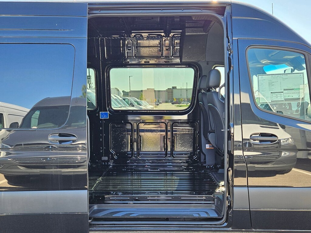 This 2025 Mercedes-Benz Sprinter 2500 comes with following features: 16" x 6.5J Steel Wheels, 3.923 Axle Ratio, 4-Wheel Disc Brakes, 5 Speakers, ABS brakes, Air Conditioning, AM/FM radio, Armrest for Driver's Seat, Armrest for Front Passenger's Seat, Bodyside moldings, Brake assist, Co-Driver Thorax-Pelvis Sidebag, Driver door bin, Driver's Seat Mounted Armrest, Driver's Seat Occupancy Sensor, Dual front impact airbags, Dual front side impact airbags, Electronic Stability Control, Emergency communication system, Exterior Parking Camera Rear, Front anti-roll bar, Front Bucket Seats, Front Passenger Airbag, Front wheel independent suspension, Fully automatic headlights, Heated door mirrors, Heated Driver's Seat, Heated front seats, Illuminated entry, Low tire pressure warning, Maturin Fabric Upholstery, No Factory Installed Flooring, Outside temperature display, Overhead airbag, Overhead console, Passenger door bin, Passenger seat mounted armrest, Power door mirrors, Power steering, Power windows, Radio: Standard, Rain sensing wipers, Rear anti-roll bar, Remote keyless entry, Speed control, Standard Driver Seat, Standard Front Passenger Seat, Steering wheel mounted audio controls, Tachometer, Tilt steering wheel, Traction control, and Variably intermittent wipers.